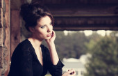 uroczy sexy kobieta w czarnych ubraniach siedzi w wspaniałej kawiarni