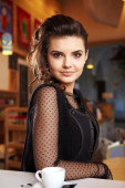 uroczy sexy kobieta w czarnych ubraniach siedzi w wspaniałej kawiarni