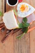 Kromka chleba, szynka, jajka sadzone ze śniadaniem.