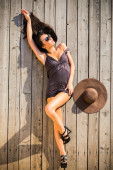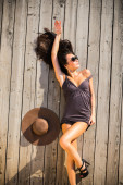 piękny model zrelaksowany leżącego na podłodze drewnianej