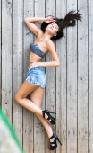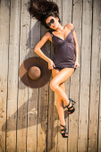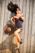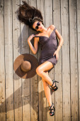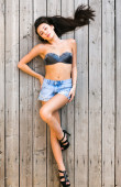 piękny model zrelaksowany leżącego na podłodze drewnianej