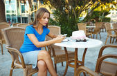 Młoda ładna kobieta, zrelaksować się w kawiarni na świeżym powietrzu i przy użyciu smartp