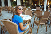 Young pretty modern blogger using smartphone and makes notes in