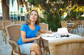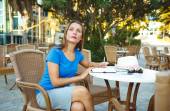 Young modern business woman makes notes in a notebook in a cafe