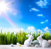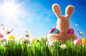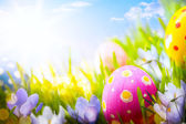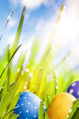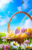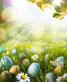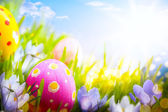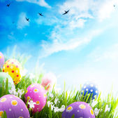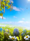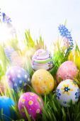 sztuka pisanki zdobione kwiatami w trawie na błękitne niebo