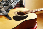 Gitara i koszulę w lewo na skrzyni na tle ściany drewniane