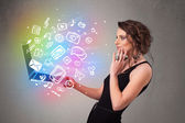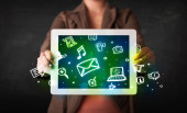Osoba trzymająca tablet z ikonami i symbolami mediów