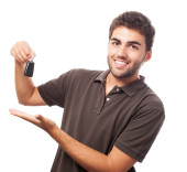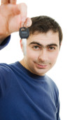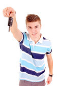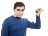 młody człowiek trzyma klucze w jego ręce, białe tło