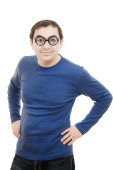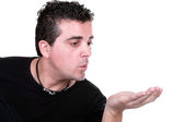 młody człowiek trzyma klucze w jego ręce, białe tło