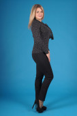 Piękna brunetka w stylowe firmy odpowiada na ciemnym tle