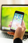 Zdjęcie "Mężczyzna ręki trzymającej ekranu Apple app wyświetlone na Iphone 6 w biurze. Apple jest najbardziej wartościowe firmy technologii na świecie. Prague, Republika Czeska - listopada 17,2015" może być wykorzystywane do celów osobistych i komercyjnych zgodnie z warunkami zakupionej licencji Royalty-free. Obraz jest dostępny do pobrania w jakości wysokiej rozdzielczości do 5760x3840.