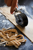 Młoda kobieta ugniata ciasta makaronowego ręcznie