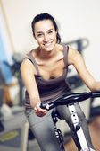 atrakcyjna młoda kobieta, opierając się na piłkę ćwiczeń na siłowni
