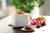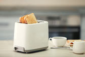 Serwowane tabeli na śniadanie z tostami i kawy, na tło zamazane pole