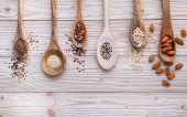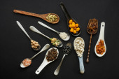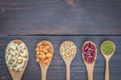 Assortment of beans and lentils in wooden spoon on teak wood bac