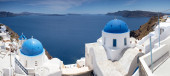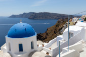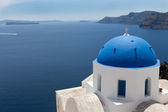 Niebieski Kopuły kościołów na Caldera w Oia na wyspy greckie
