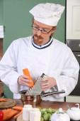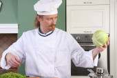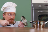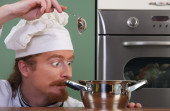 śmieszne młody kucharz z garnka