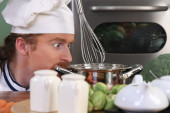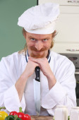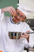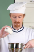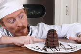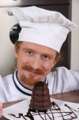 śmieszne młody szef kuchni dodaje sosem czekoladowym bułka z masłem