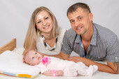 Five-year girl, mother and newborn baby are looking into the frame