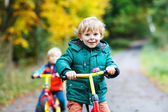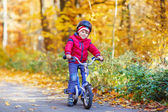 Mały chłopiec dziecko i ojca z rowerem w lesie jesienią