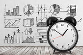 Four models of pocket watches are hovering in the air over financial graphs background. A concept of a value of time in financial markets. Forex chart. 3D rendering.