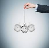 A model of pocket watch which is hanging on the chain. A concept of a value of time in business. Light blue background. 3D rendering.