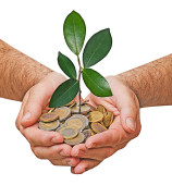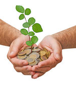 dłonie z growng drzewo ze stosu monet