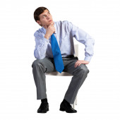 mężczyzna siedzi na krześle. Na białym tle. podejmuje decyzje. agresywne. ręka pod brodą