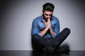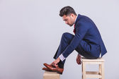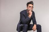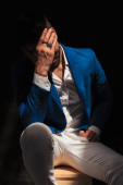 człowiek w garnitur, siedząc w studio z palmy razem patrząc w dół