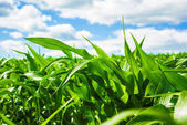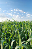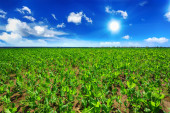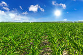 zielone pole z młodych kukurydzy na zachodzie słońca