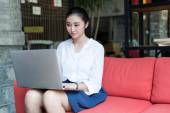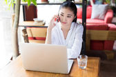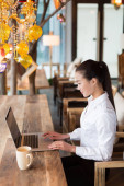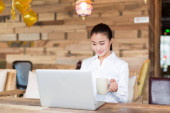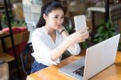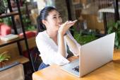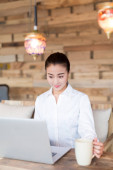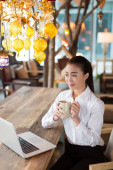 uśmiechający się młoda kobieta jest siedzieć w kawiarni