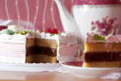dwie warstwy ciastko z kwiat różowy i biały lukier cukier