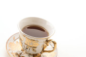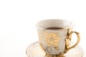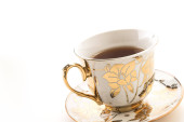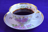 porcelanowa filiżanka i spodek na drewnianym stołem