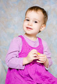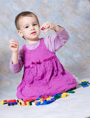 dziecko w rózowej sukni z zabawkami