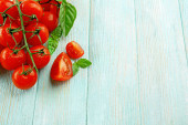 Świeże pomidory z bazylią na drewnianym stole z bliska