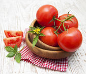 Świeże pomidory z bazylią na drewnianym stole z bliska