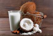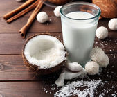 Cukierki w płatki kokosowe, szklankę mleka i świeżego kokosa na ciemnym tle drewniane