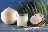 Zdjęcie "Cukierki w płatki kokosowe, szklankę mleka i świeżego kokosa na ciemnym tle drewniane" może być wykorzystywane do celów osobistych i komercyjnych zgodnie z warunkami zakupionej licencji Royalty-free. Obraz jest dostępny do pobrania w jakości wysokiej rozdzielczości do 5760x3840.