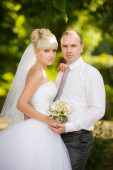 pana młodego i panny młodej w parku jesienią chodzić w pobliżu drzewa z żółtym