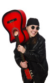 Młoda kobieta gitara gracz na białym tle
