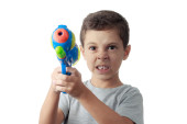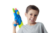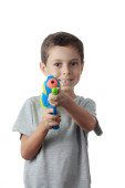 Mały chłopiec bawi się z tworzywa sztucznego pistoletem na wodę na białym tle.