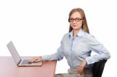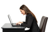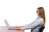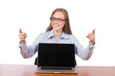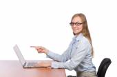 Pracownik biurowy przy stole pracy odizolowany na biało
