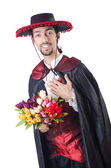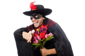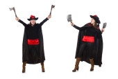 Dziewczyna w czarno-czerwonym karnawale garnitur izolowany na białym