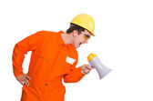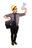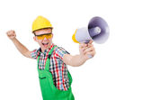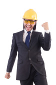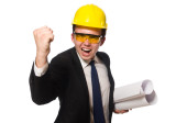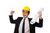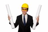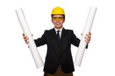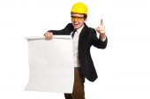 Zabawny architekt z rysunkami na białym