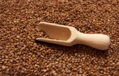 Gryka w drewnianą łyżką na tle gryka.