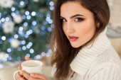 Ładna kobieta w jasny sweter siedzi w pobliżu nowego roku drzewo