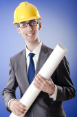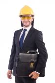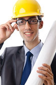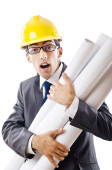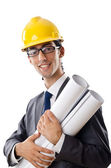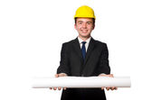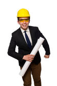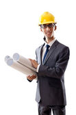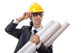 Młody architekt z rysunkami na białym tle