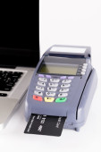 Dłoni przesuwając karty kredytowej z laptopa w tle