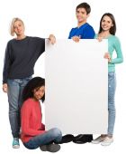 Grupa szczęśliwy nastoletnich przyjaciół posiadający olbrzymie puste papierowe z miejscem