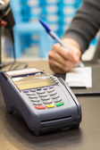 Dłoni przesuwając karty kredytowej w sklepie: Selektywne Focus